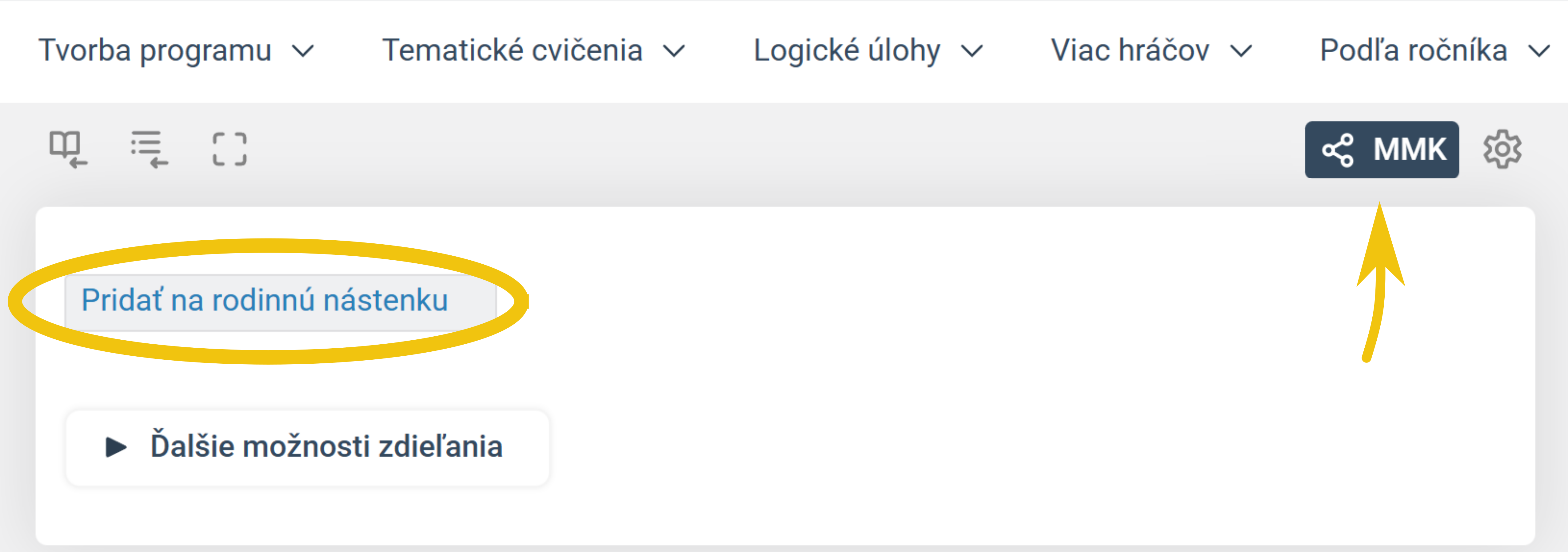 Cvičenie je možné pripnúť ako úlohu aj priamo zo stránky konkrétneho cvičenia. Tlačidlo na zdieľanie nájdete v pravom hornom rohu otvoreného cvičenia.