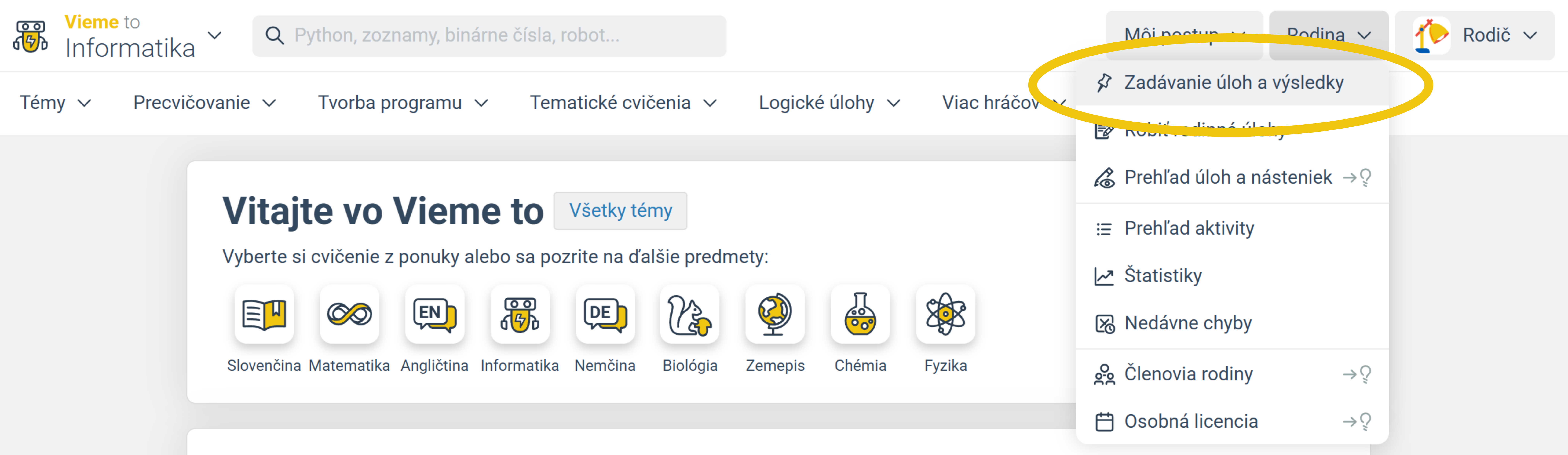 Zadávať úlohy členom rodiny je možné ako tzv. sady na stránkach jednotlivých predmetov, napr. Vieme to – Informatika, v záložke Rodina → Zadávanie úloh a výsledky.